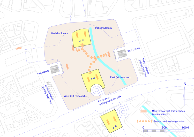 The JR North and Central Exits to the north and south of this space measuring around 200m on one side, and the vertical shafts and taxi stands one of each to the east and west divide off the four open areas of Hachiko Square, Patio Miyamasu, the East Exit forecourt and West Exit forecourt, with the space beneath the Yamanote and Saikyo Lines (main platforms) connecting these to form a single space. |