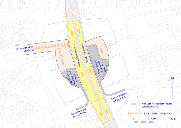 The western side is the main passageway connecting to the Shibuya station of the Inokashira Line. Buses going toward Setagaya come down a slope from the third floor, driving under the Route 246 bypass at this level, then head out toward Setagaya again. On the east side are stops for buses taking Route 246 toward Roppongi. |